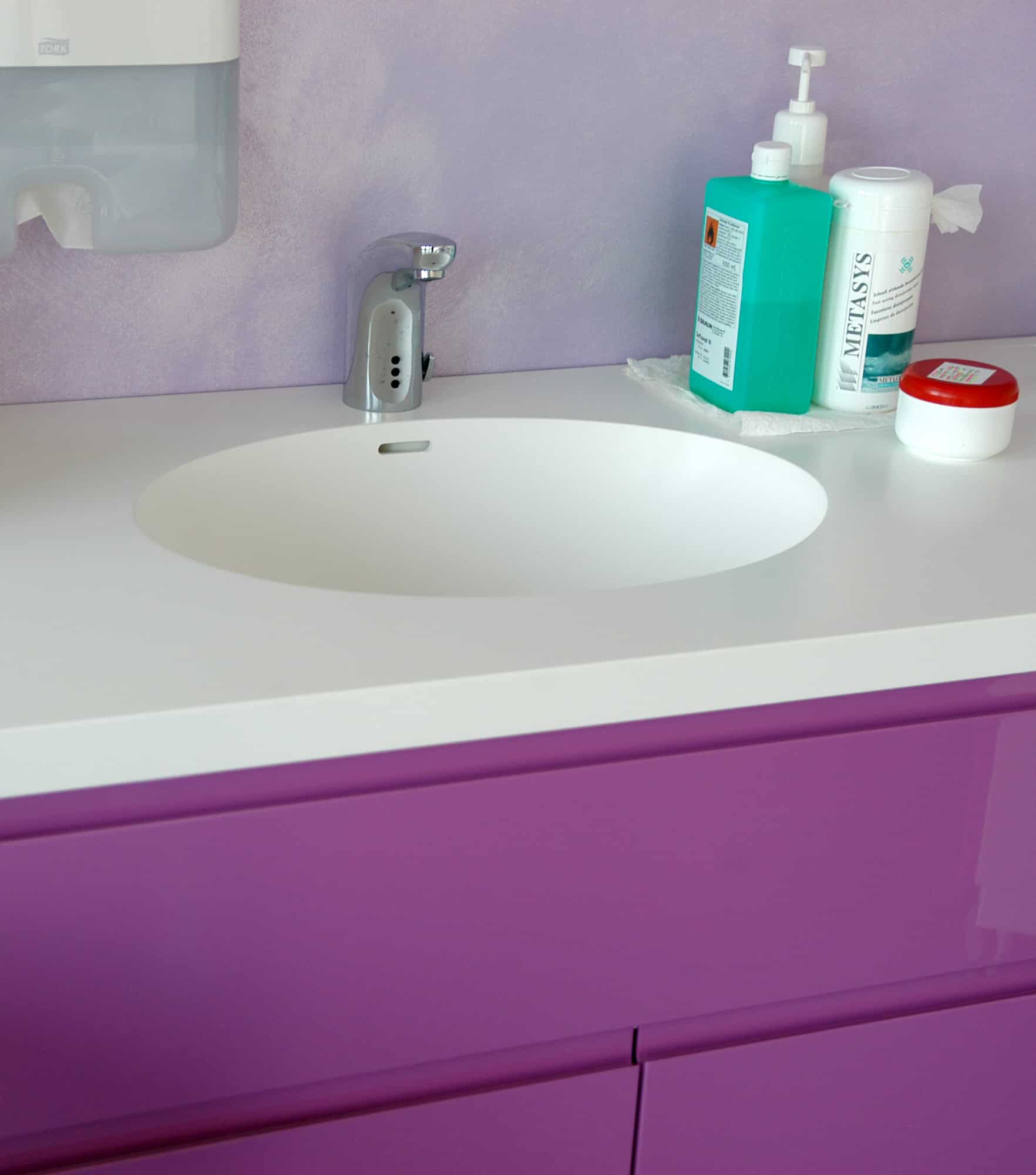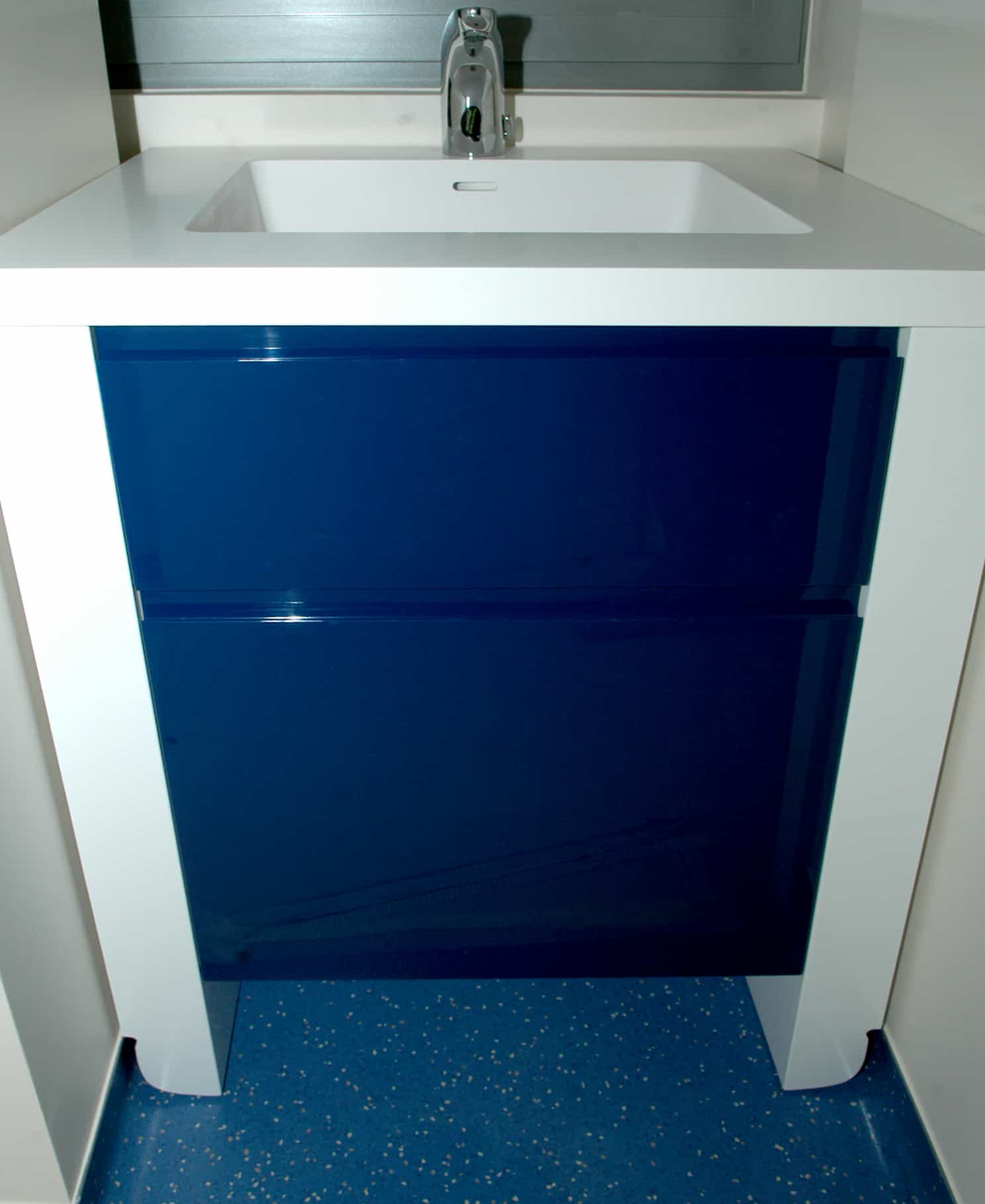 Radne podloge, umivaonici i sudoperi su izrađeni kao kompaktne cjeline od mineralnih ploča proizvođača Rehau.